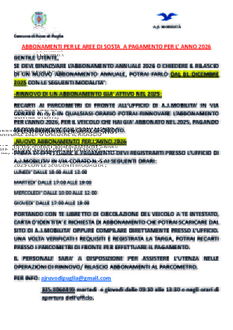 Trasmetti il modello e la ricevuta del pagamento (LINK AL MODELLO PDF)alla mail ajruvodipuglia@gmail.com o consegnalo presso il nostro ufficio in via Corato n. 5 negli orari di apertura. Dopo la consegna ti verrà comunicato un codice, e le informazioni necessarie per usufruire delle soste acquistate.