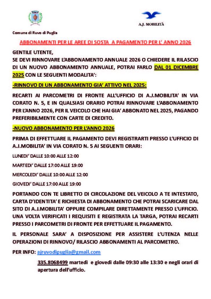 Trasmetti il modello e la ricevuta del pagamento (LINK AL MODELLO PDF)alla mail ajruvodipuglia@gmail.com o consegnalo presso il nostro ufficio in via Corato n. 5 negli orari di apertura. Dopo la consegna ti verrà comunicato un codice, e le informazioni necessarie per usufruire delle soste acquistate.